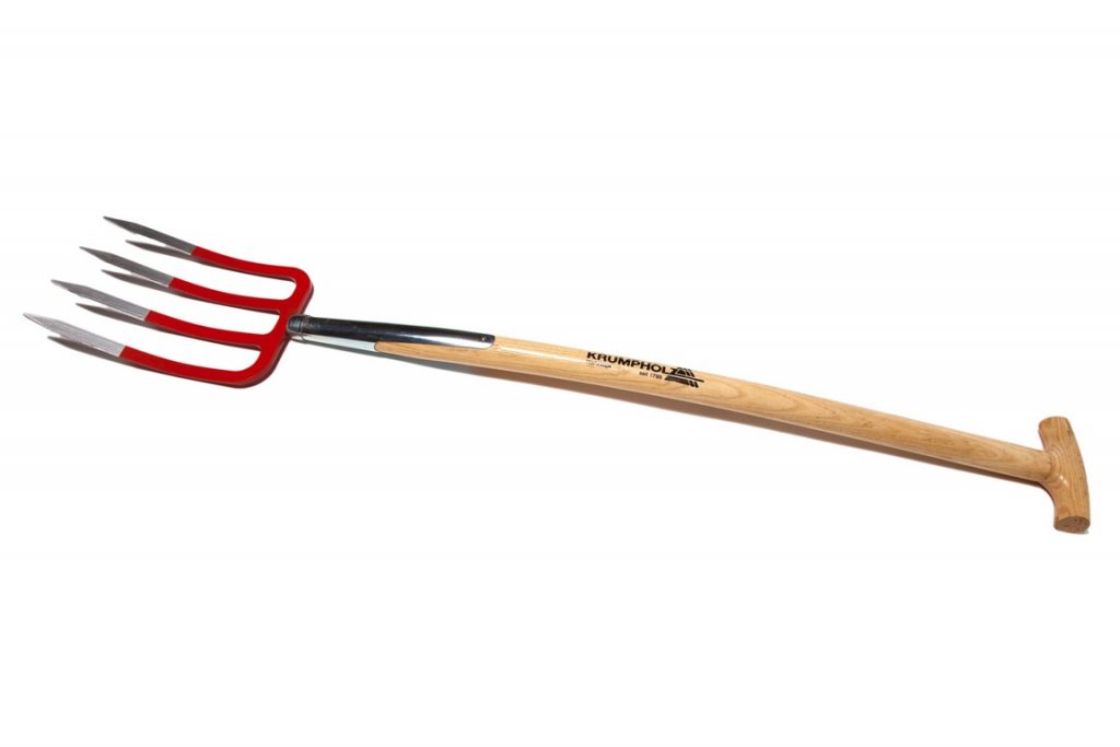 4-zębowe widły ogrodowe z jesionowym styliskiem osadzonym na tulei.